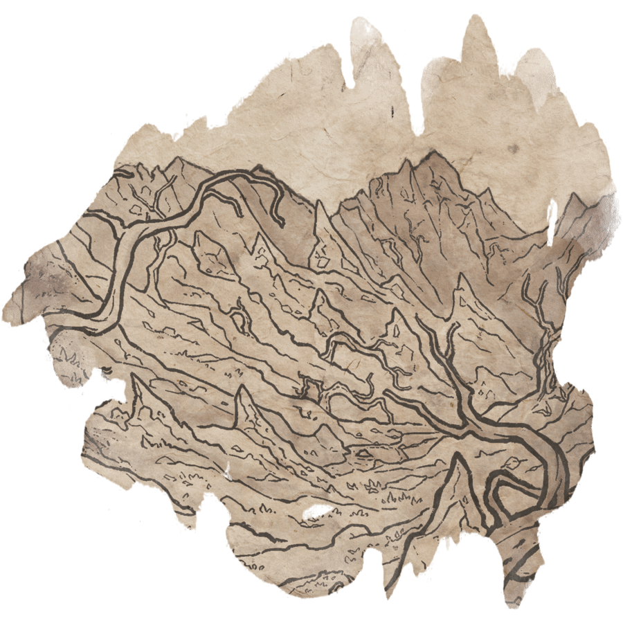 El vacío se reveló como una mentira cuando llegamos al final de la llanura. La tierra se partió, se abrochó como si un puño con espinas y cota de malla hubiera golpeado hacia arriba. Las escarpadas formaciones rocosas se alzaban como astillas de hueso a través de la carne del suelo. Se inclinaban en todas direcciones, algunas delgadas y afiladas como espinas, otras curvas como garras y otras retorcidas sobre sí mismas, elevándose en una agonía pétrea. Las sombras se acumulaban como sangre en sus bases.