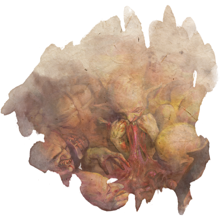 La oscuridad se transformó en una horda de horrores degradados que se precipitaban hacia nosotros. Los goblins, con la piel verde por la podredumbre, las mandíbulas abiertas y babeando, salieron corriendo de los huecos entre las formaciones a nuestra izquierda y derecha. Mi carne se estremeció al verlos. Atacaron con una ferocidad y descaro nunca vistos en los goblins de las montañas. En sus garras, sus dientes y su saliva estaba la amenaza de la Mancha. Un solo rasguño o mordisco, si salía sangre, significaba la perdición. Los goblins se dispersaron y nos rodearon en cuestión de segundos. Esgrimían ramas rotas y huesos como garrotes. Parloteaban y escupían, como si la podredumbre de la tierra buscara encontrar su lenguaje a través de sus voces.