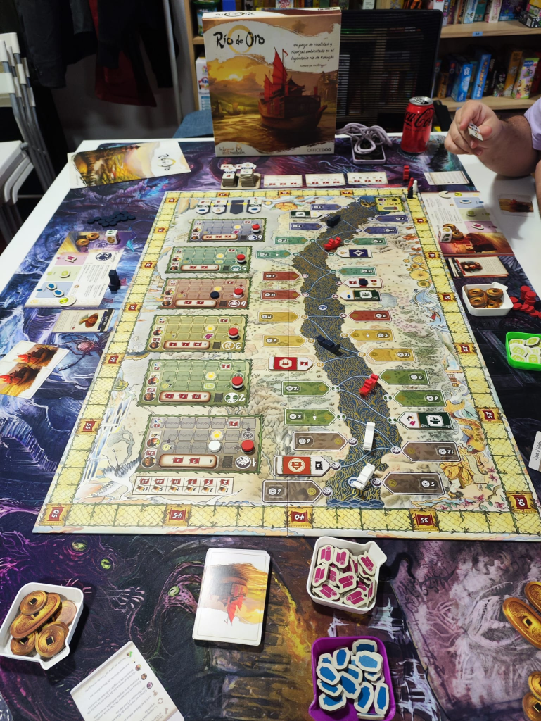 ¿Qué nos propone Río de Oro? Una experiencia muy similar a la que ya nos ofrecía Iki. Casi da pena, porque los dos son muy buenos juegos, que se diferencian por lo justo. En esencia tenemos un juego de gestión de recursos y colocación de «hoteles». Iremos navegando por el río, y creando puestos comerciales en diferentes paradas (como en la calle del Iki o el citado Monopoly. Después, aquellos que caigan en nuestras casillas, se llevarán un beneficio y nosotros otro por haberlas creado en primer lugar.