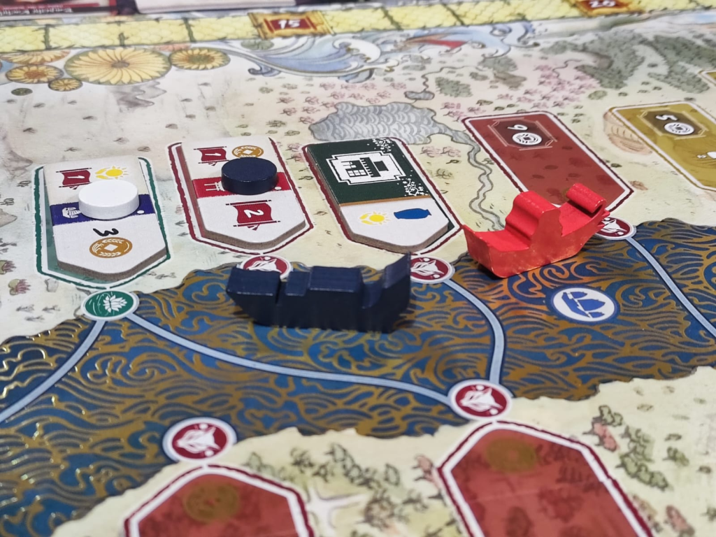 Si lo dejamos aquí, no hay nada que realmente diferencie al juego de Leyenda de los 5 anillos de sus competidores más directos. Afortunadamente encontramos algunas diferencias notables que hacen que la experiencia de Río de Oro sea única. Pero para eso mejor ahondamos un poco en las reglas del juego. Contamos con dos barcos que podremos hacer navegar río abajo (las mercancías se recogen en el norte, se baja comerciando con ellas y luego los navíos suben sin nada de vuelta al norte).