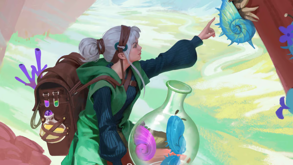 Finalmente caliente, Taru se estira y se escabulle de su cómodo escondite, flotando junto a ella, sus apéndices revoloteando mientras se interesa por una planta que está siendo levitada cerca por la maga Yzmir. Es una delicada flor blanca, con el tallo cubierto de una fina pelusa. Sus pétalos son casi transparentes, ribeteados con un tenue borde azul, y su pistilo brilla con un sutil tono dorado. La había arrancado con cuidado durante su expedición, asegurándose de que no sufriera daño alguno al guardarla en un rincón de su bolsa sin fondo.