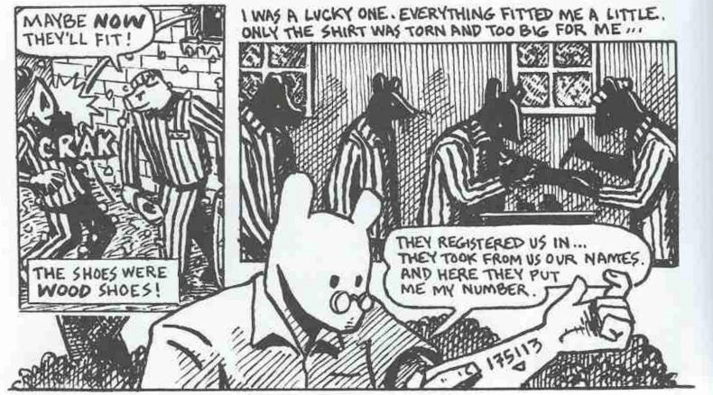 Que por otra parte, es lo que tiene sentido que ocurra. Los sucesos narrados por Vladek (algunos de los cuales quedaron registrados en las cintas audio de dichas entrevistas) son verdaderamente atroces. Y el hecho de que no sean anónimos. El hecho de que aunque la memoria de Vladek pueda ser más o menos precisa, nos relate lo que vivió en sus propias carnes. El hecho de que veamos un número tatuado en un brazo dibujado, a sabiendas de que dicho brazo estuvo delante del autor durante décadas. En la piel de una persona real, con nombre y apellidos. Toda esta cercanía hace que la totalidad del relato, terrorífico ya de por si. Resulte todavía más abrumador.