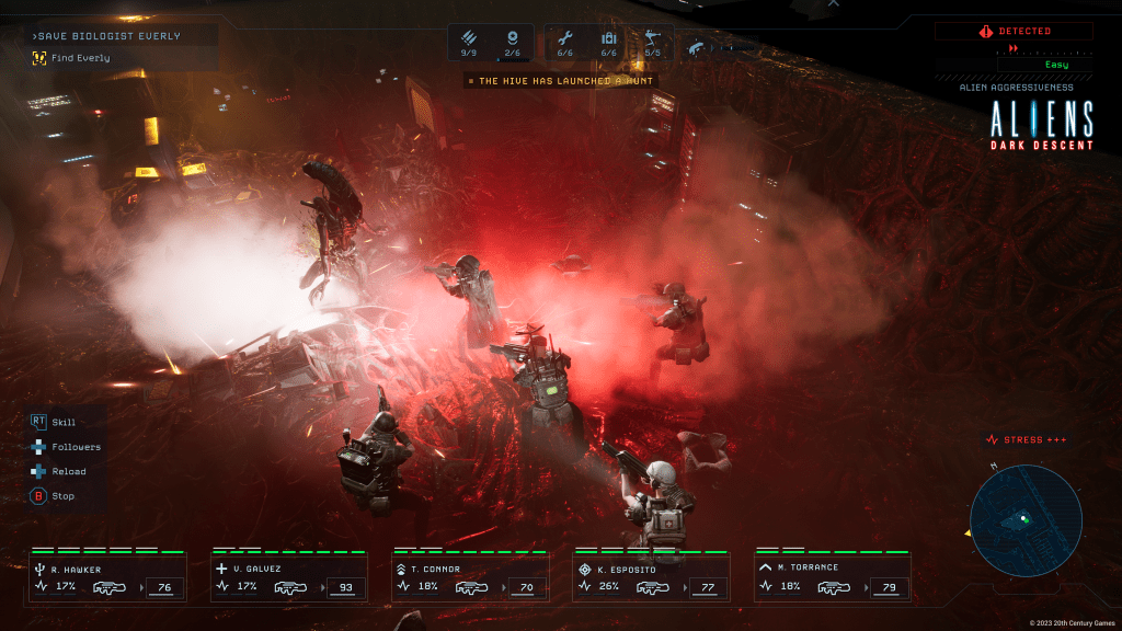 Podría llevarme horas escribiendo sobre qué mecánicas particulares convierten a Aliens: Dark Descent en una experiencia sobre la franquicia particularmente fiel. Pero como no somos una revista de videojuegos, prefiero hacer mejor un picadito de impresiones que estoy seguro que el paladar educado sabrá apreciar. El tener que explorar las habitaciones manualmente con la linterna para descubrir puntos de interés que explorar. El uso de los rastreadores de movimiento, totalmente fundamentales para movernos con relativa seguridad por los escenarios. El emplazamiento de torretas automáticas que nos cubran, o las habilidades de los marines como el uso de escopetas, fuego de supresión, lanzamiento de bengalas, colocación de minas… Todo grita Alien a pleno pulmón.