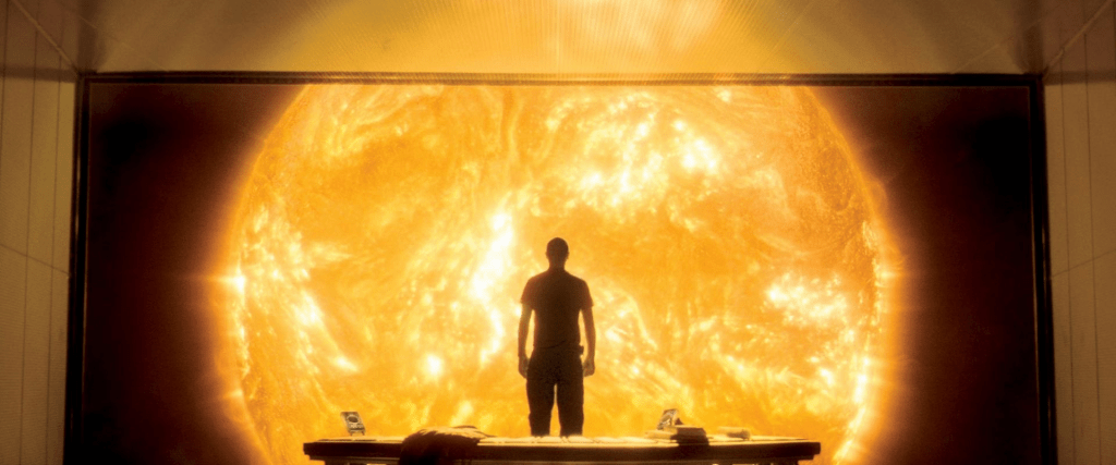 Asumidas ciertas cosas que dan absolutamente igual, empieza el deleite. Hablamos de una película escrita por Danny Boile y guionizada por Alex Garland. Un dúo que ya nos habían maravillado con La Playa y 28 días después. Y en el caso de Sunshine no es baladí esta dupla, ya que nos encontramos con un guion de acero (recordando a los presentes que guion no es trama, si no estructura narrativa) donde en la hora y tres cuartos que dura la película, no queda una rendija por la que se pueda escapar nuestra atención lejos de la pantalla. Toda la acción está medida al milímetro. Y lo que es mejor, dirigida y montada de forma espectacular. Danny Boyle sabe dónde colocar la cámara en cada momento y sumado a esto, cómo cortar cada plano para que el ritmo te agarre por el cuello desde el inicio y no te suelte hasta el final.
